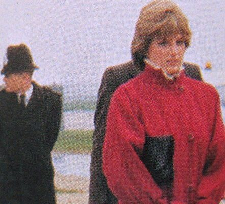 Dressed in a red coat, fawn skirt, and brown leather shoes, Diana walked beside the Prince through puddles at the airport after arriving in the Queen’s Rolls-Royce.